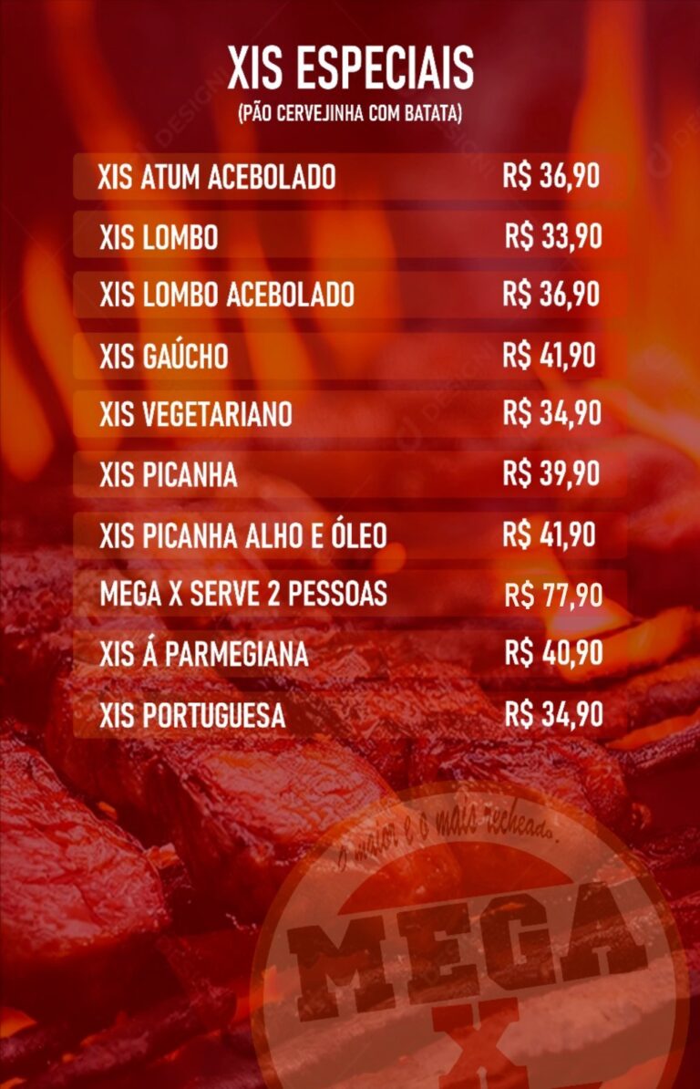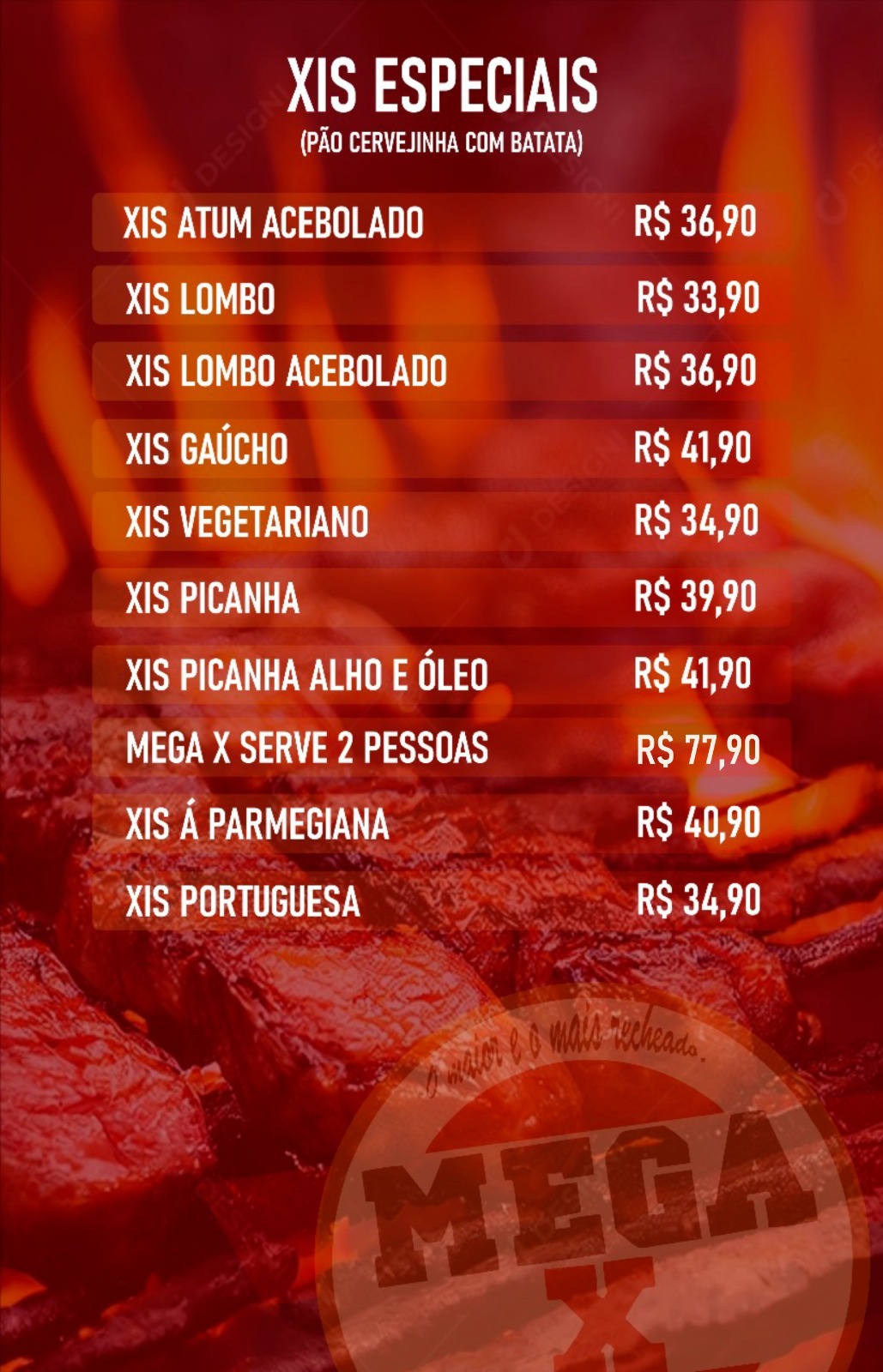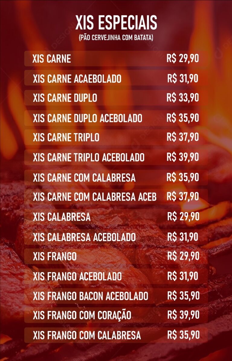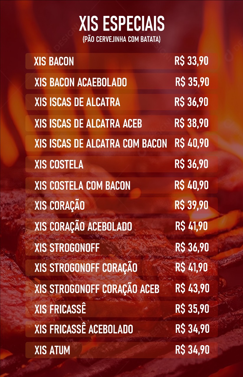 Todos os Xis acompanham: Maionese, milho, ervilha, tomate, alface, ovo, queijo e batata frita dentro do xis.