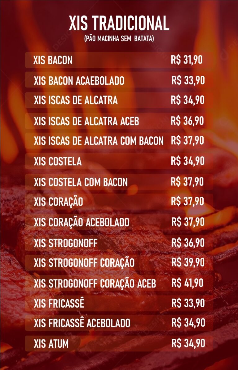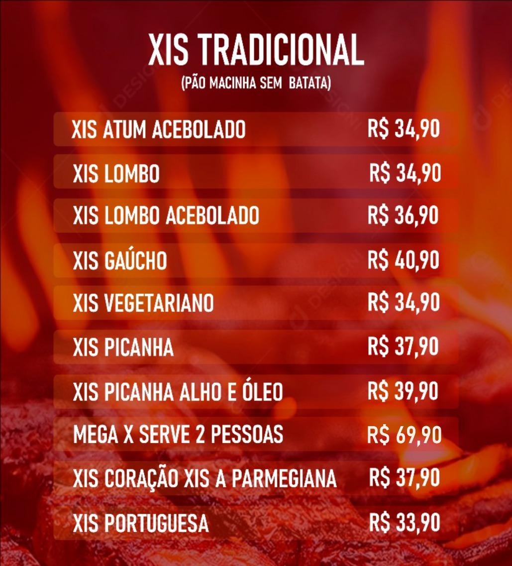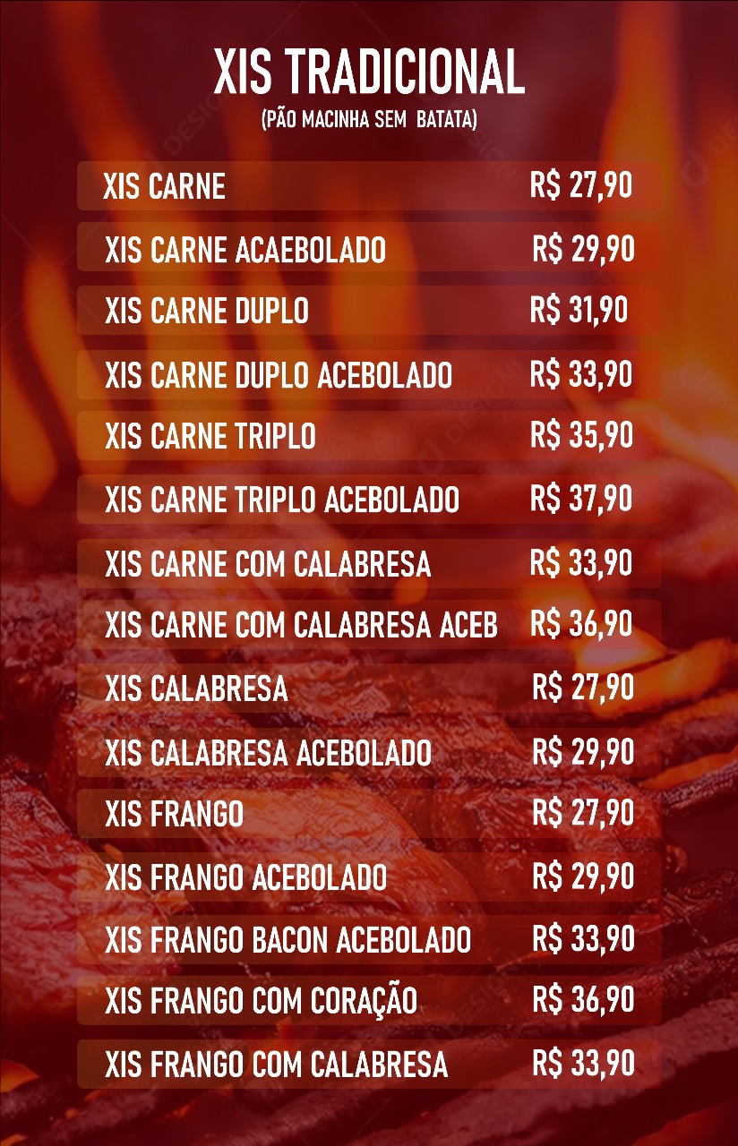 Todos os Xis acompanham: Maionese, milho, ervilha, tomate, alface, ovo, queijo e batata frita dentro do xis.